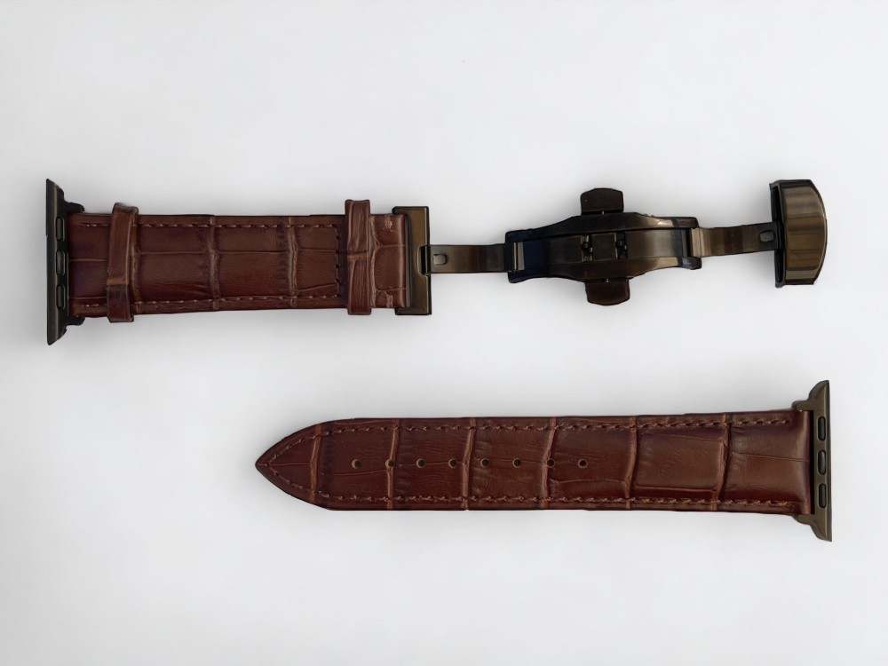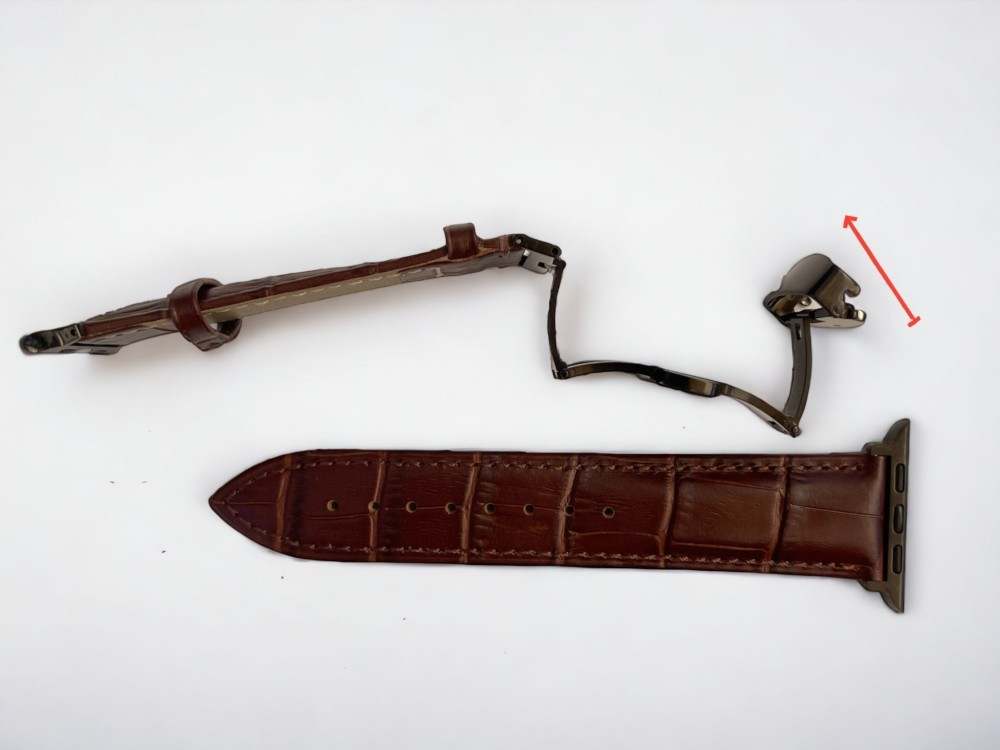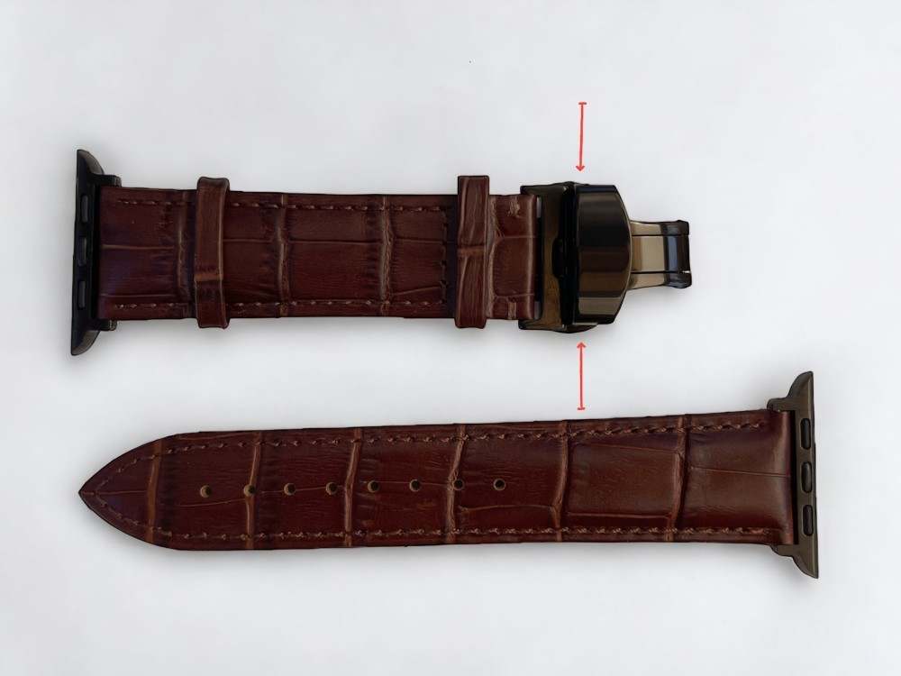 Your Apple Watch alligator embossed band is now resized to your wrist. To put the band on or to take off, simply press the two buttons on the buckle shown in image 1 (step 1).